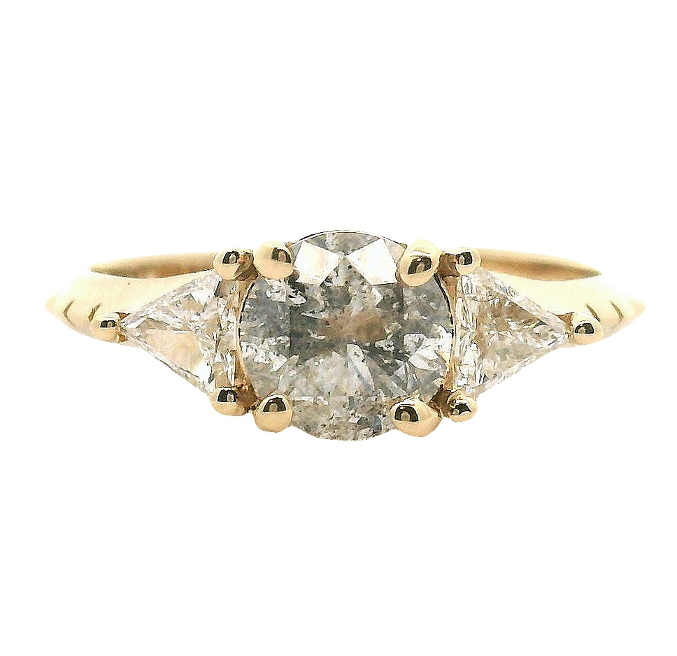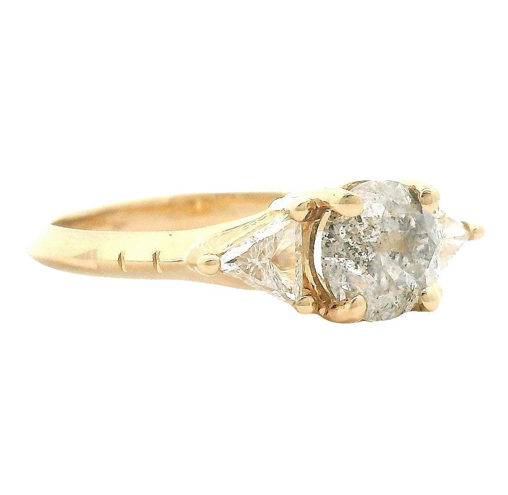 14k recycled yellow gold, round brilliant cut Galaxy diamond, two .15 ct. VS GHI 4x4 triangle diamonds.