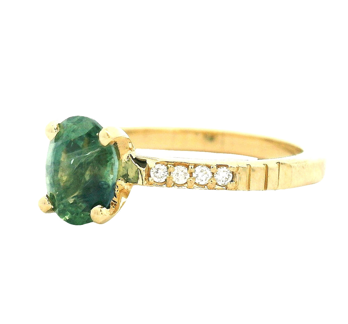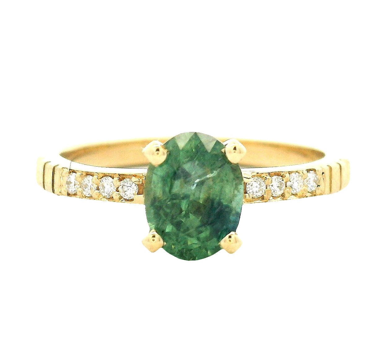 A rich and bright forest green, oval cut Montana sapphire is held in a secure by 4 prongs on our diamond pavé Milky Way style band. The green color is natural right out of the earth. This is a non-heat treated Montana sapphire that shines with flashes of pine green, chartreuse and hints of a rich teal. There is a visible whips of an inclusion, as well as a blot of a rich dark indigo blue inside this beautiful stone. These elements feel like evidence of the artist creator in this art piece. A perfect example of why we love Montana sapphires for all their individuality!
