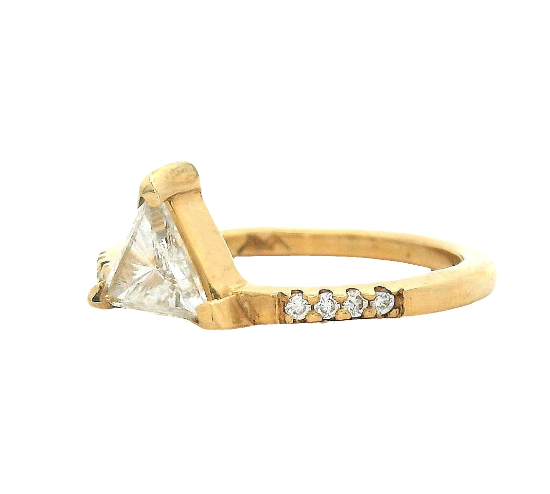 Solitaire Ring: 14k gold, 8 total .0075 ct white diamonds, and an approx. 6x6x6 mm triangle white diamond with GHI SI2-3 grading. This diamond does not come with a report.