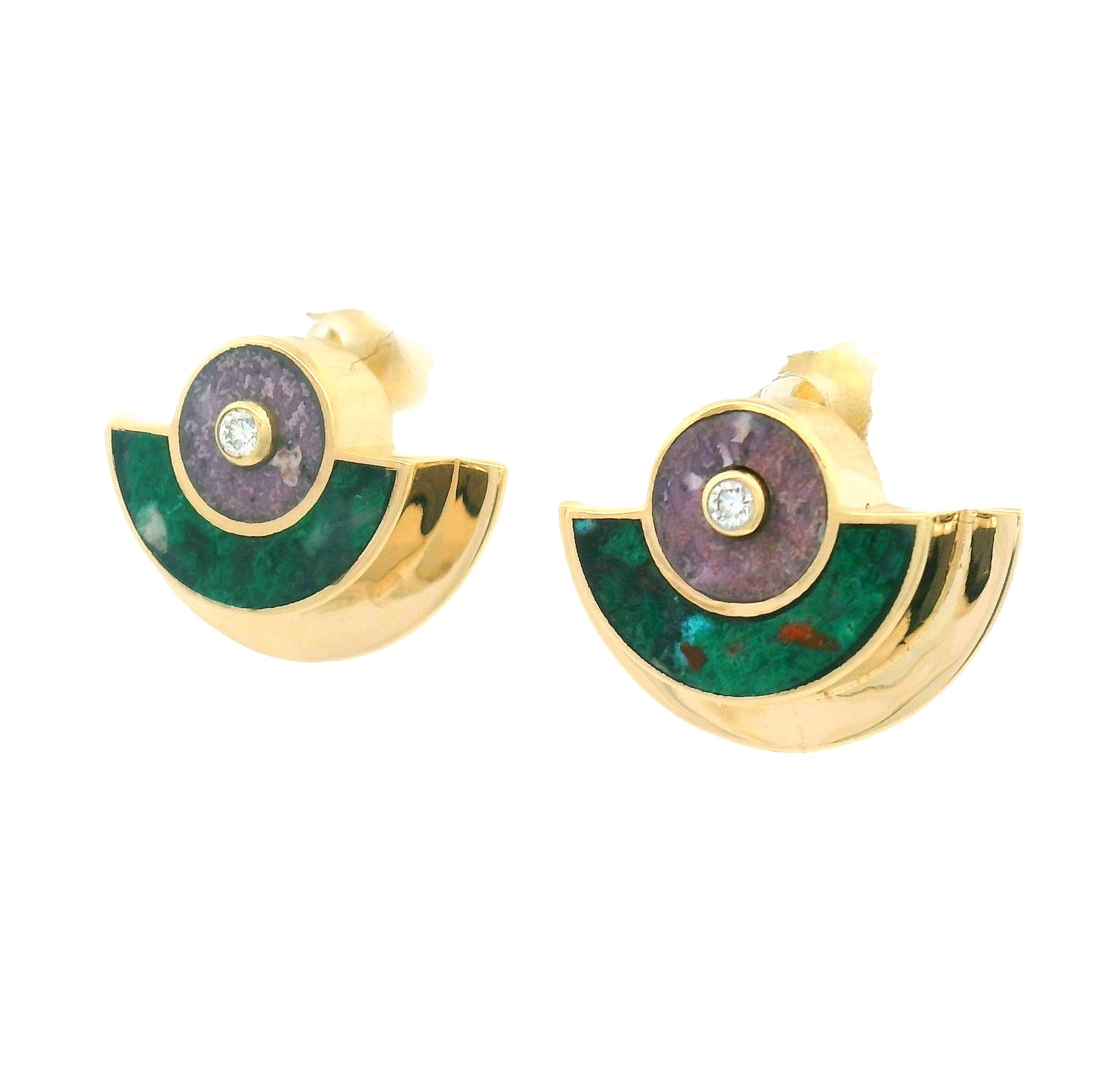 Purple Burro Creek Agate is inlaid at the center with a bezel set bright white diamond. The sparkle of the diamond really brings focus to these colorful earrings. Chrysocolla with its depth and variations of green compliments the purple.