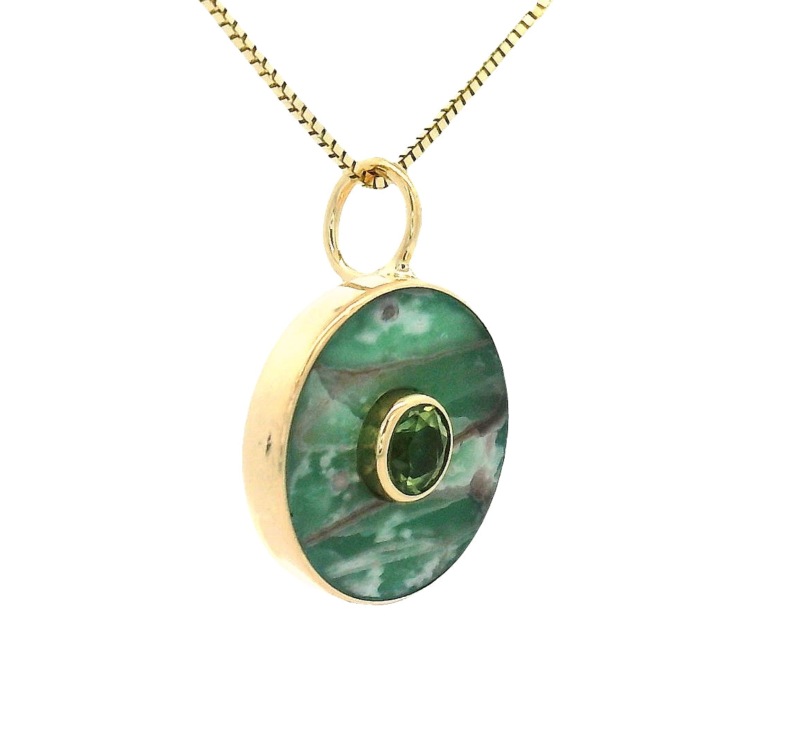 This ethical jewelry pendant features a psychedelic green Lucin variscite inlay, responsibly sourced from Utah, with a Colorado-mined peridot set at its center. The variscite displays organic swirls of brown and soft green, creating a planet-like pattern that is completely natural and entirely one of a kind. The result is a vibrant mix of earthy green tones that cannot be replicated, making each pendant truly unique.