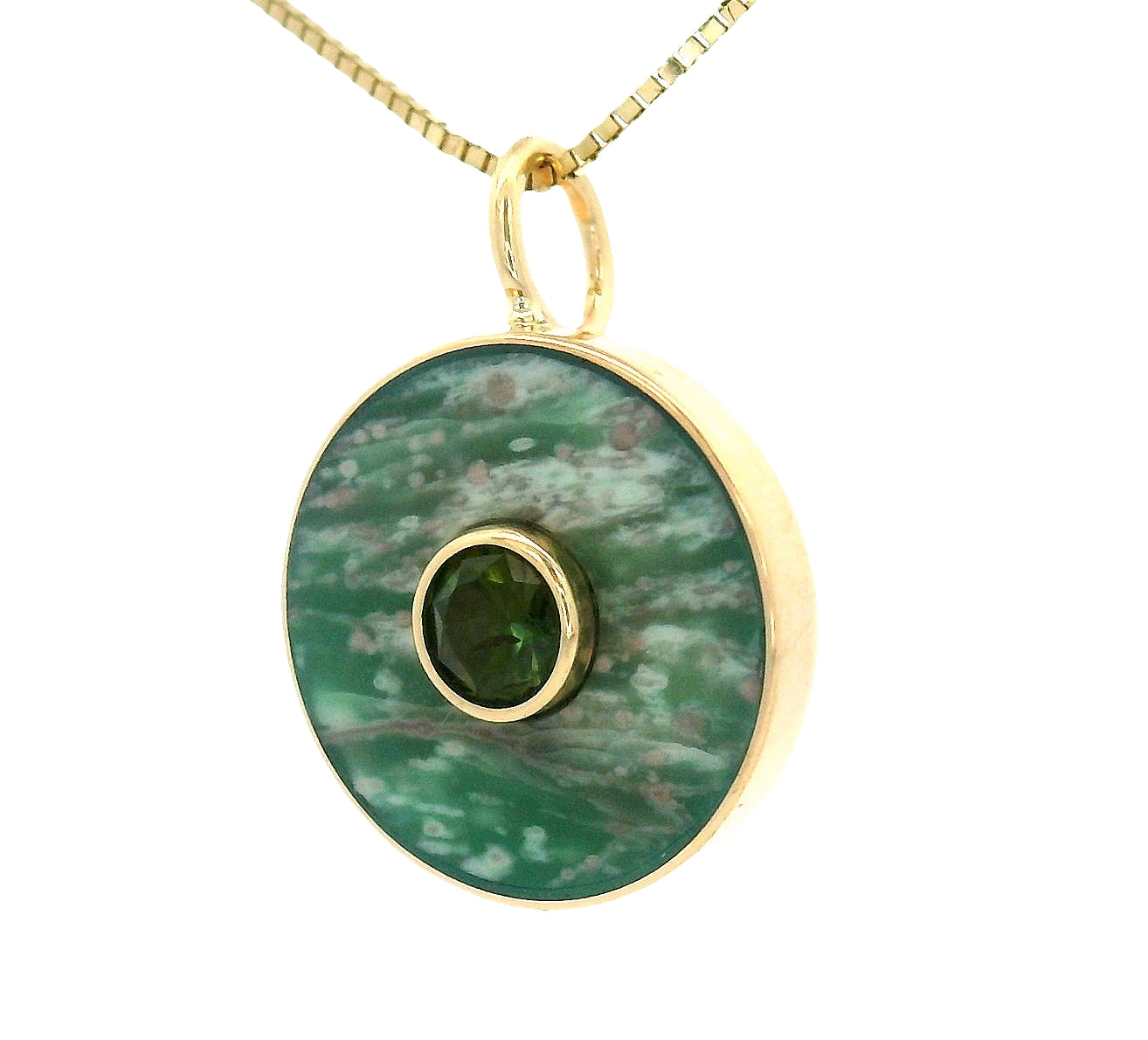 This ethical jewelry pendant features a psychedelic green Lucin variscite inlay, responsibly sourced from Utah, with a Colorado-mined peridot set at its center. The variscite displays organic swirls of brown and soft green, creating a planet-like pattern that is completely natural and entirely one of a kind. The result is a vibrant mix of earthy green tones that cannot be replicated, making each pendant truly unique.
