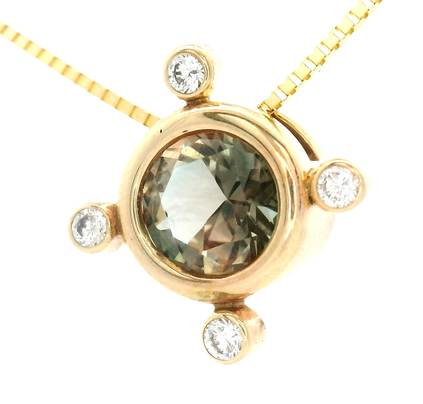 14k recycled yellow gold, four .03 ct. reclaimed white diamonds, 7 mm sunstone from Oregon.