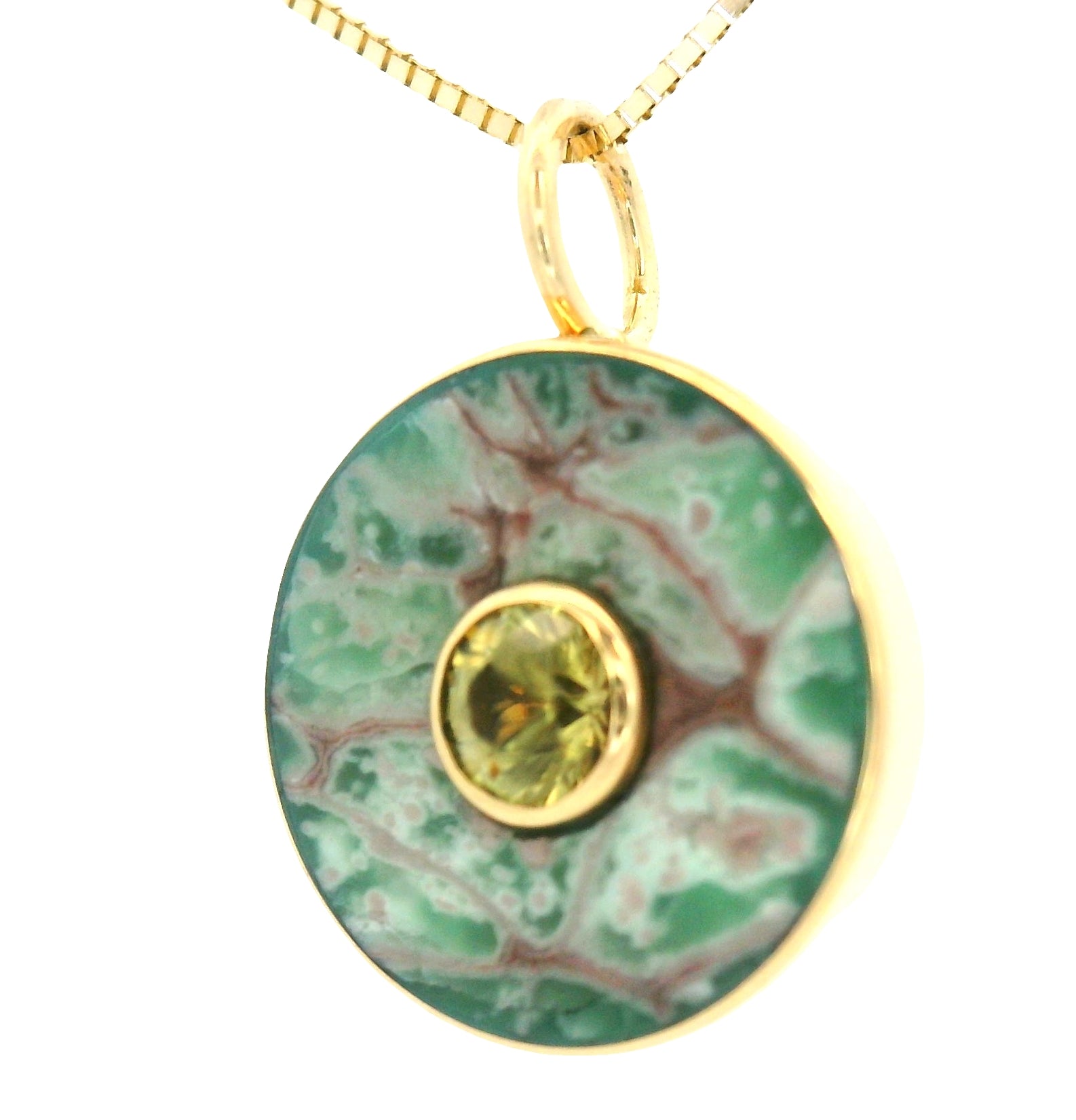 This ethical jewelry pendant features a psychedelic green Lucin variscite inlay, responsibly sourced from Utah, with a Colorado-mined peridot set at its center. The variscite displays organic swirls of brown and soft green, creating a planet-like pattern that is completely natural and entirely one of a kind. The result is a vibrant mix of earthy green tones that cannot be replicated, making each pendant truly unique.