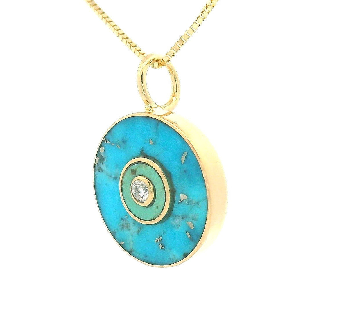 A necklace featuring layers of American-mined turquoise with a reclaimed white diamond at the center. The pyrite inclusions sparkle and add an extra bit of natural beauty to this green and blue turquoise necklace. This 10 mm in pendant can slide freely on a chain.