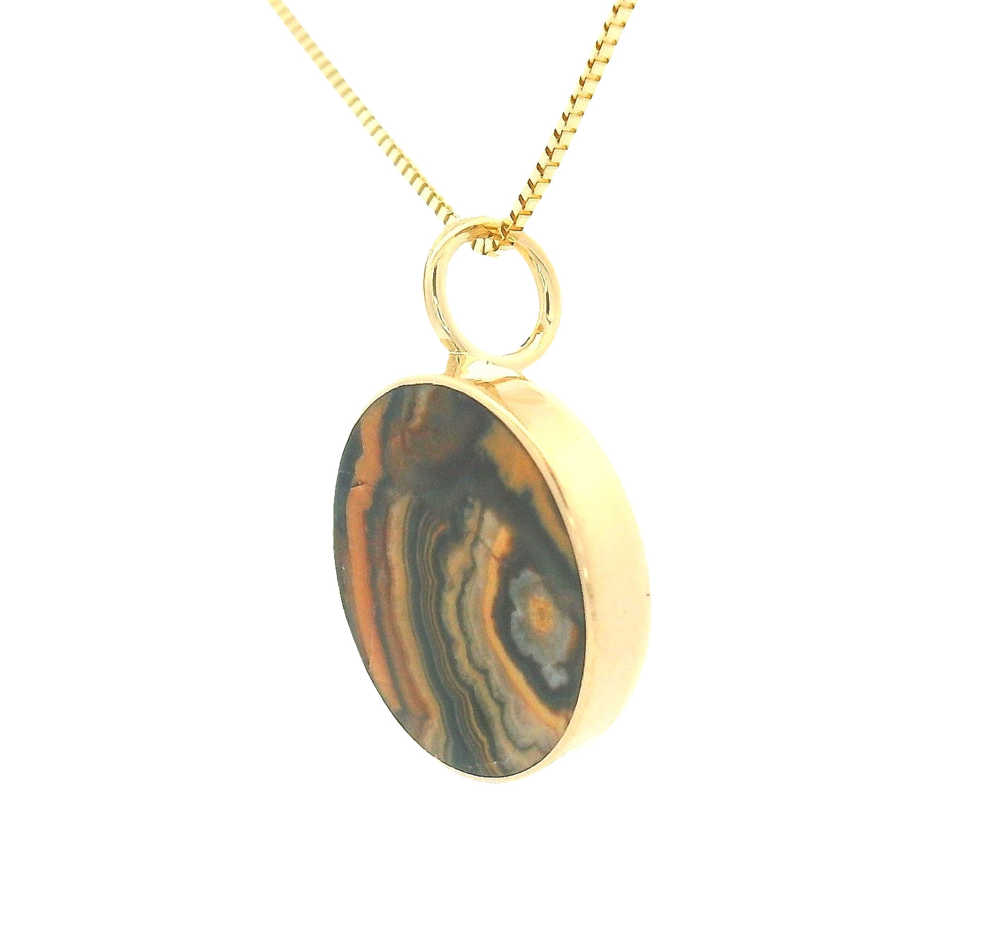 A beautiful piece of tube onyx with striations  of browns, creams and pumpkin orange is hand cut and shaped to fit perfectly inside this 14k yellow gold 10mm bezel. The pattern is a frenzy of earthy color and energy.