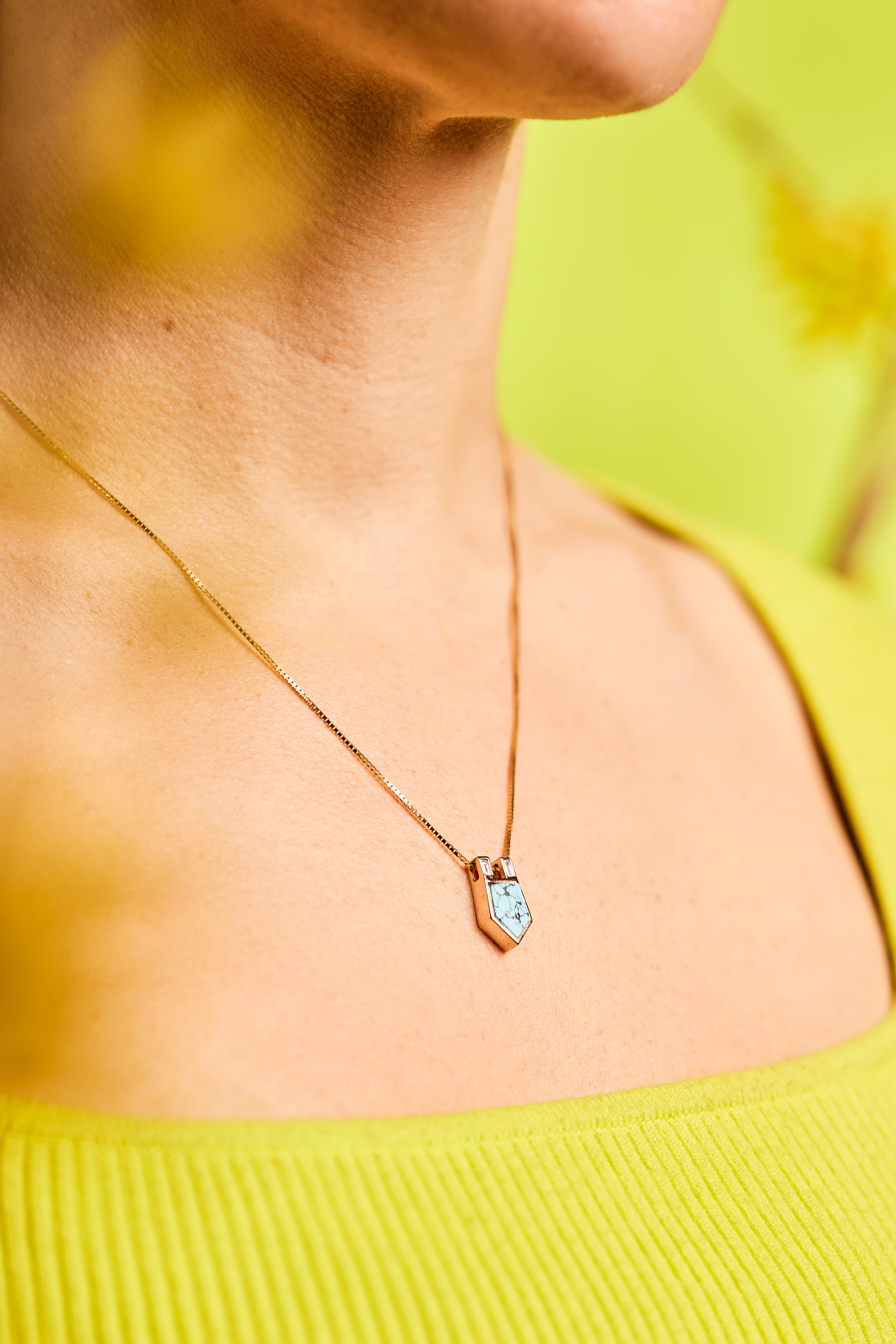 An etherial inlay of Mother Of Pearl is inlaid in 14k gold with two white baguette diamond accents. We love how this pendant looks like the head of a bull. Perfect for an Taurus in your life.  The pendant slides on a .75 mm 18 inch box chain.