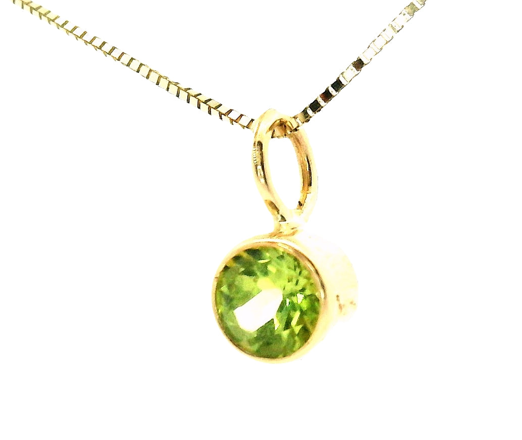 A sleek and eye-catching 4 mm bezel-set Colorado Peridot is hugged in warm yellow gold. This pendant hands from a sparkly and dainty 16" chain. Perfect for layering.