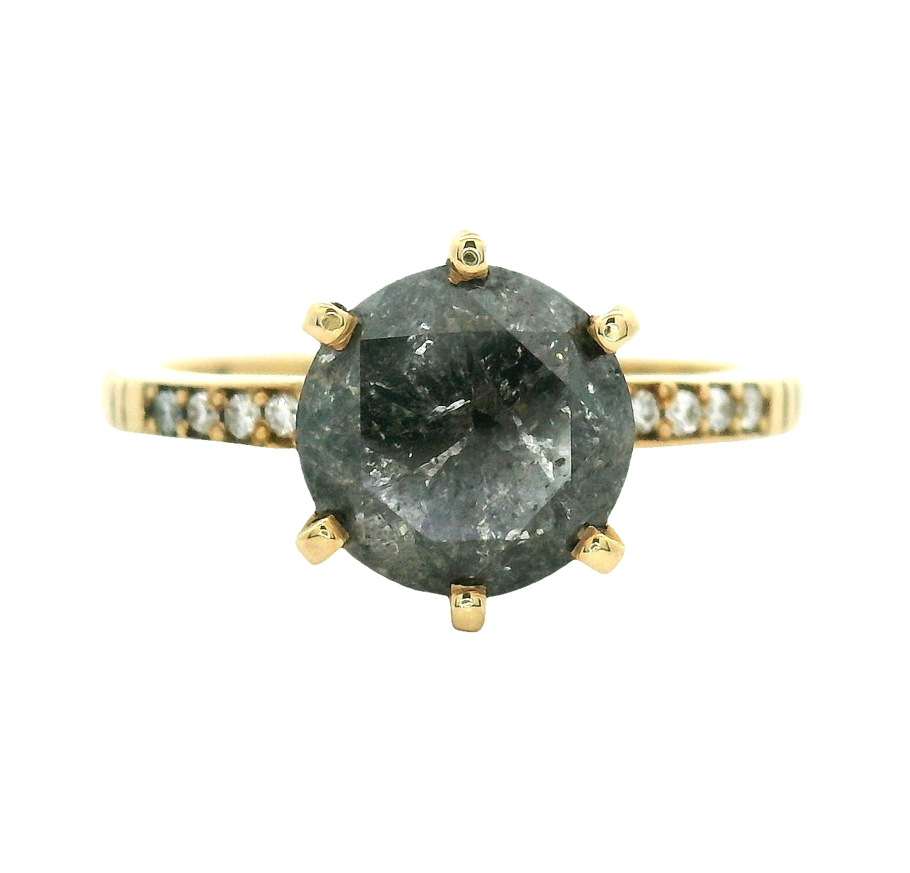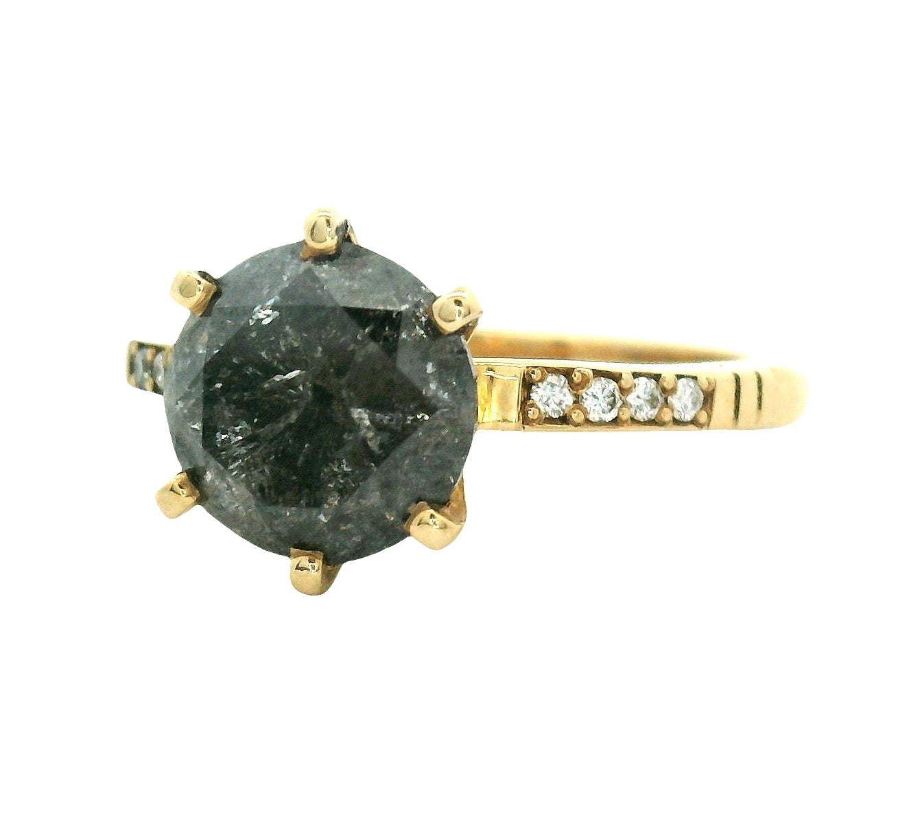 14K recycled yellow gold, 2.82 ct. galaxy diamond, and 8 total .0075 ct. reclaimed white diamonds.