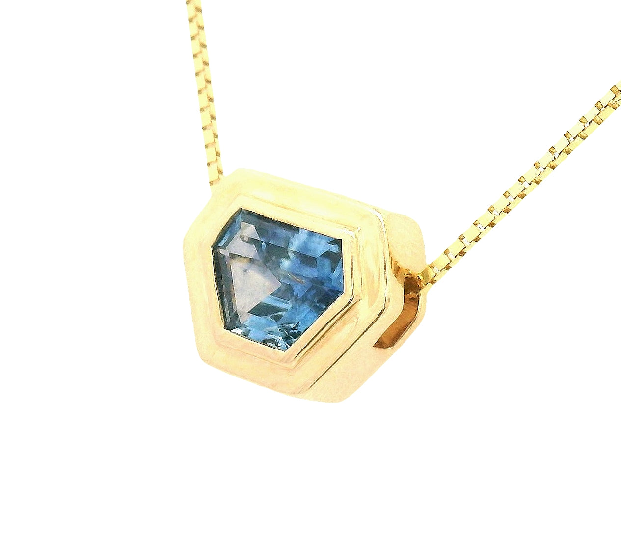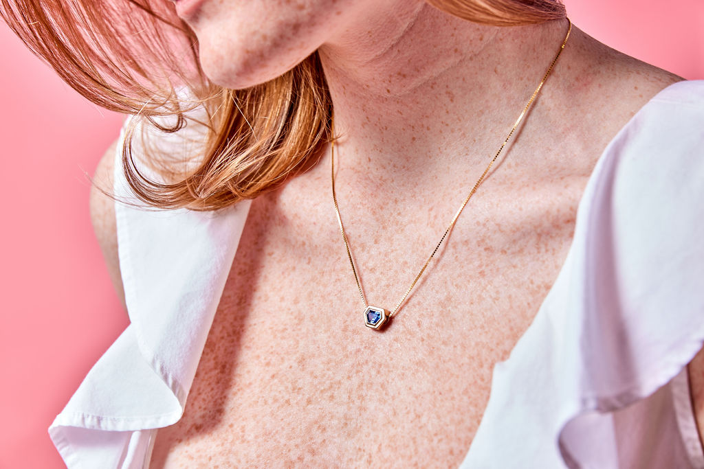 A rich royal-blue calf-head cut Montana sapphire is bezel set and glides freely along our 0.75 mm, 18-inch golden box chain. Strong enough for daily wear and refined enough for layering.