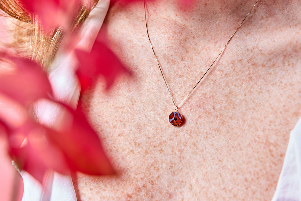 This ethical jewelry pendant features a floral and rich piece of Wingate Pass Plume agate  from California, with a California-mined spessartine garnet set at its center. The plume agate bursts with orange and red floral patterns, creating a bouquet-like pattern that is completely natural and entirely one of a kind. The result is a vibrant mix of desert tones that cannot be replicated, making each pendant truly unique and a ode to California.