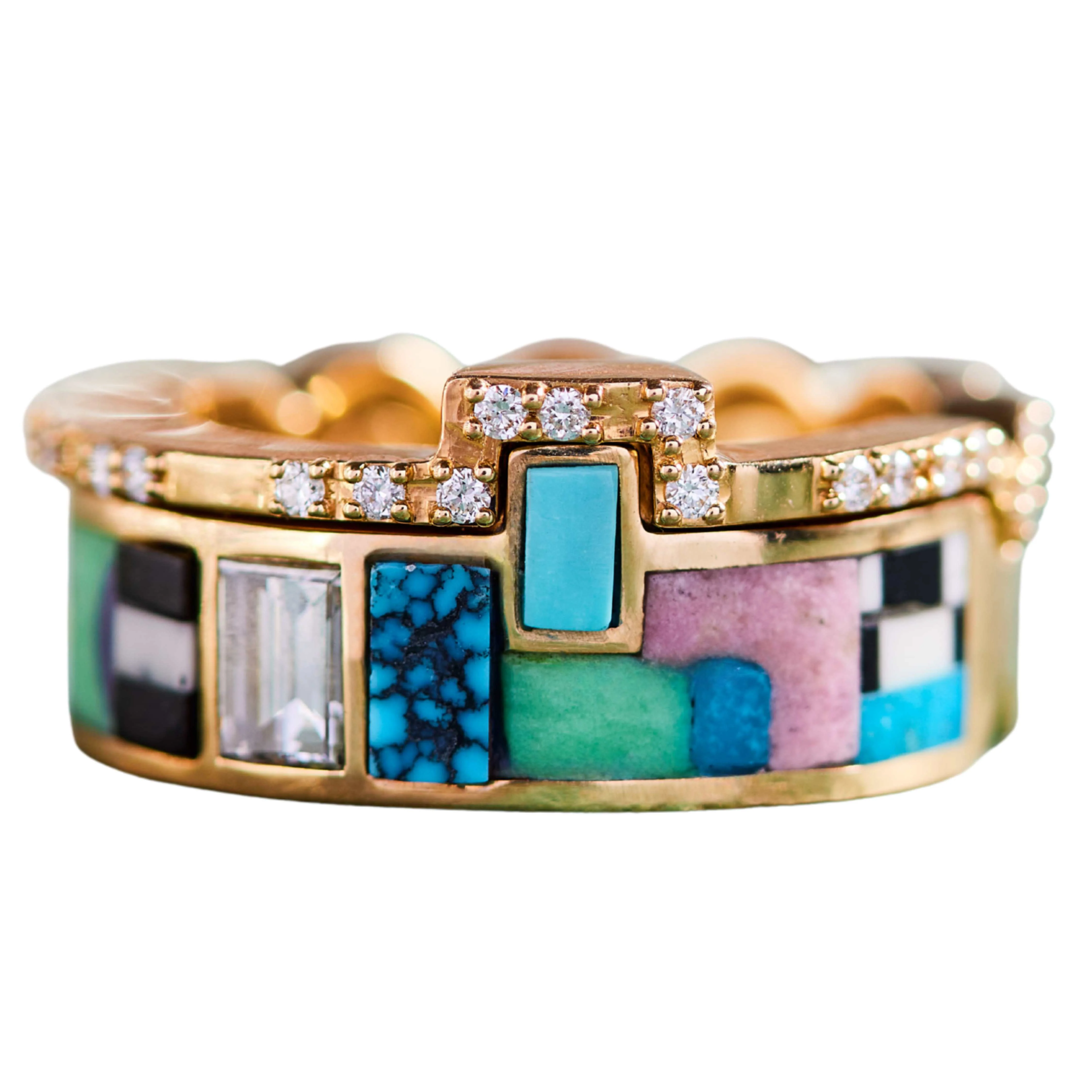 Each inlay ring is constructed by precisely setting hand-cut stones into a gold framework, creating a colorful and original composition where color and form are celebrated.