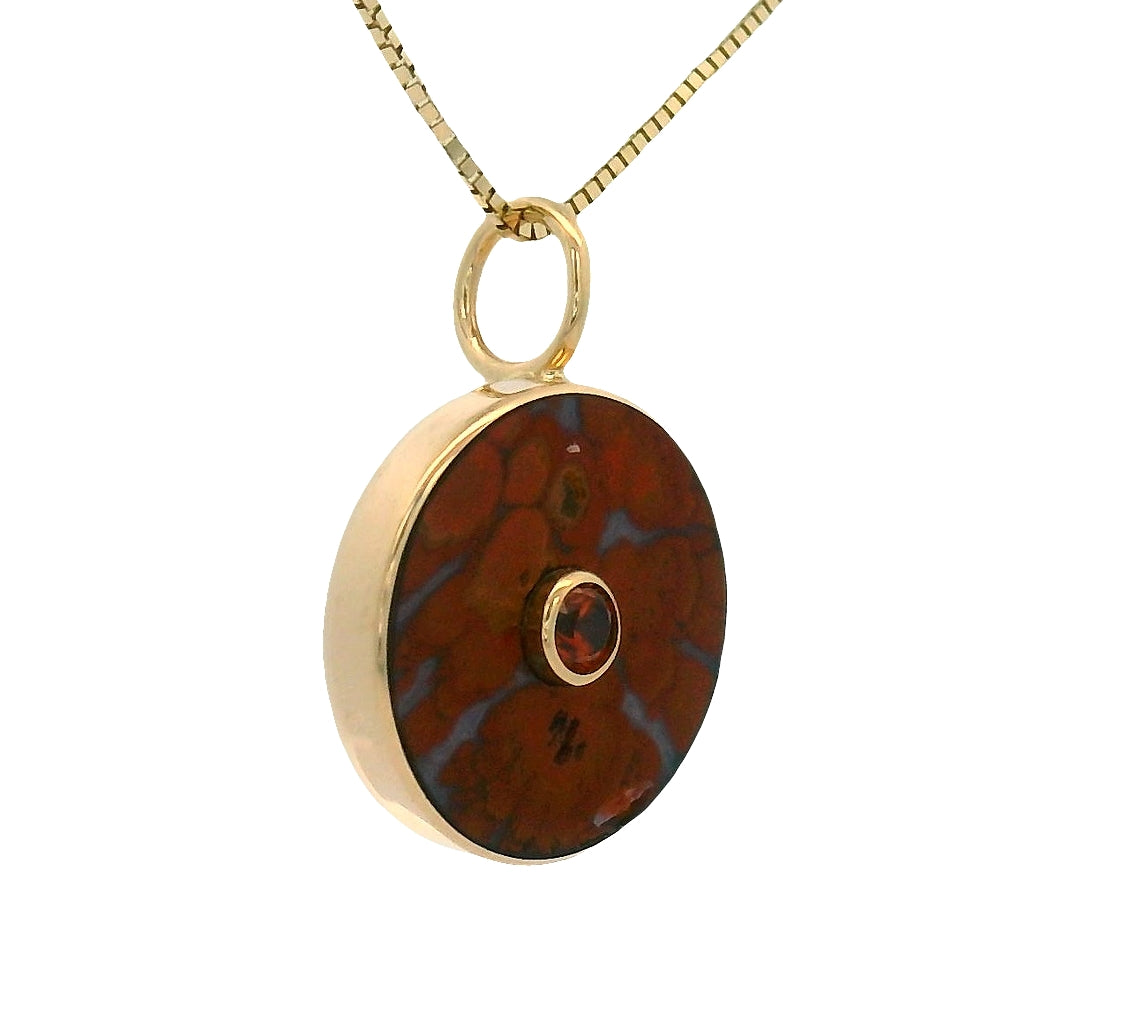 This ethical jewelry pendant features a floral and rich piece of Wingate Pass Plume agate  from California, with a California-mined spessartine garnet set at its center. The plume agate bursts with orange and red floral patterns, creating a bouquet-like pattern that is completely natural and entirely one of a kind. The result is a vibrant mix of desert tones that cannot be replicated, making each pendant truly unique and a ode to California.