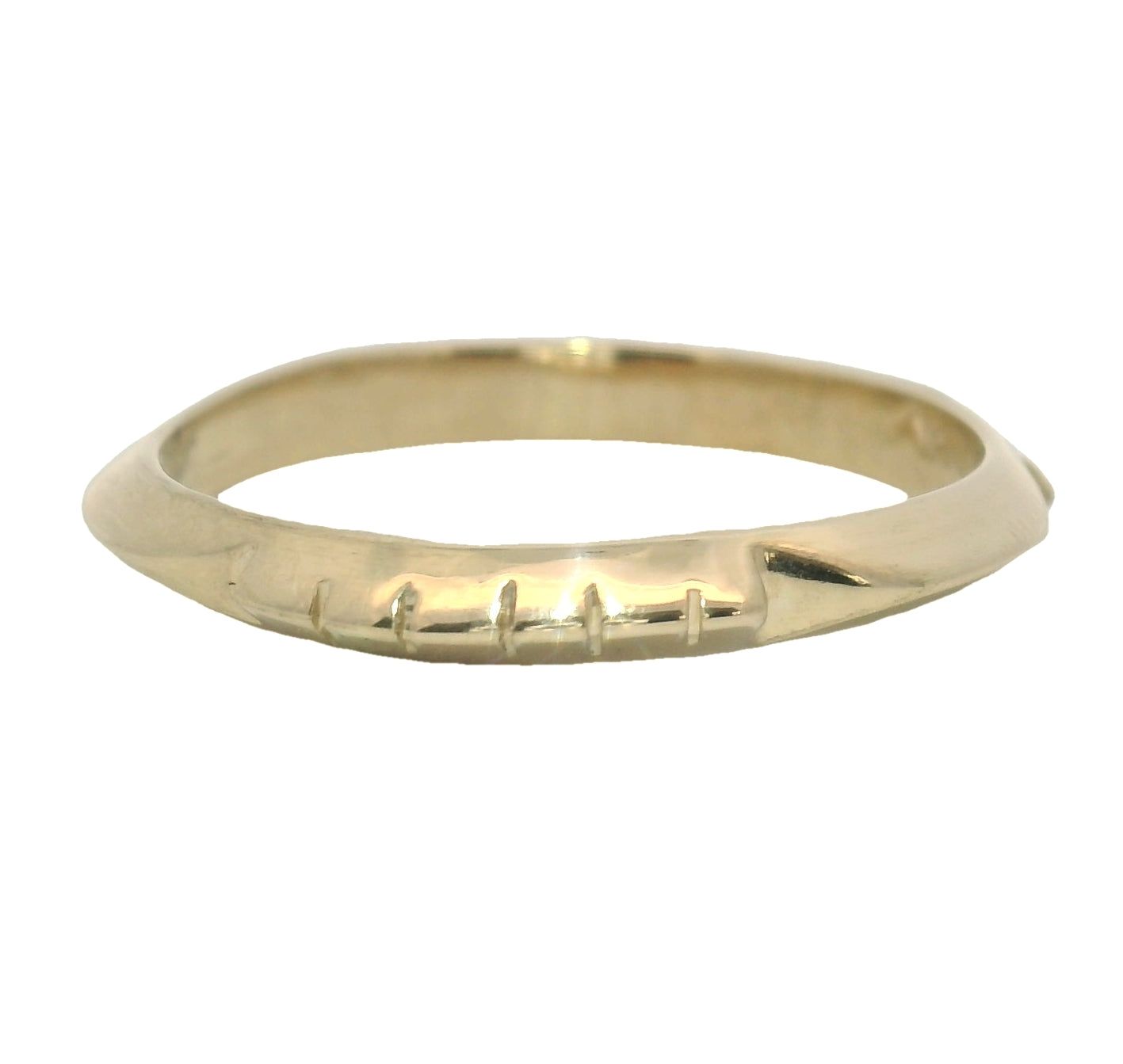 Hand carved details on pure 14k gold bands in the signature Helena pattern. The rings look amazing worn in a stack of 2-3, the carved edges look like beautiful gears on your finger. Measures 2.8mm wide at the base, 2mm thick at the peak.