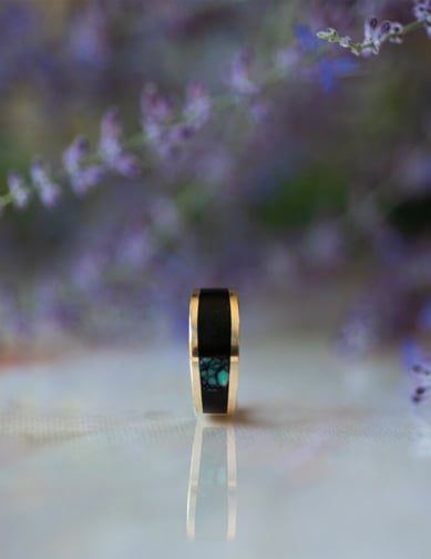 This wide gold and inlay stone band is perfect for celebrating your love. The inlay band tapers in the back for comfortability. Use this bright pop of color in a stacking set, or keep it simple and wear it on its own.