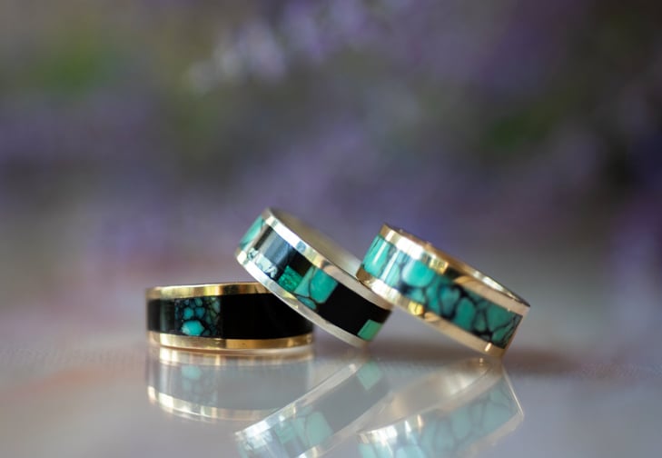 All jewelry requires care and attention. Jewelry should be taken off before bathing, swimming, yoga, applying lotions, working out, doing the dishes, etc. etc.  We recommend a simple pure gold band as the everyday forever..ever wedding ring. Our inlay jewelry can be worn as the occasion permits.