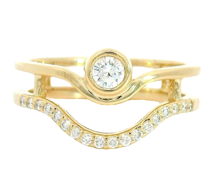 A 14k gold arched band features a post-consumer genuine white diamonds is bezel in the valley of the arc. Let this ring symbolize your journey into motherhood or any other grand adventure you might be on. This ring is available in various sizes that can be resized up or down within in 3 sizes.