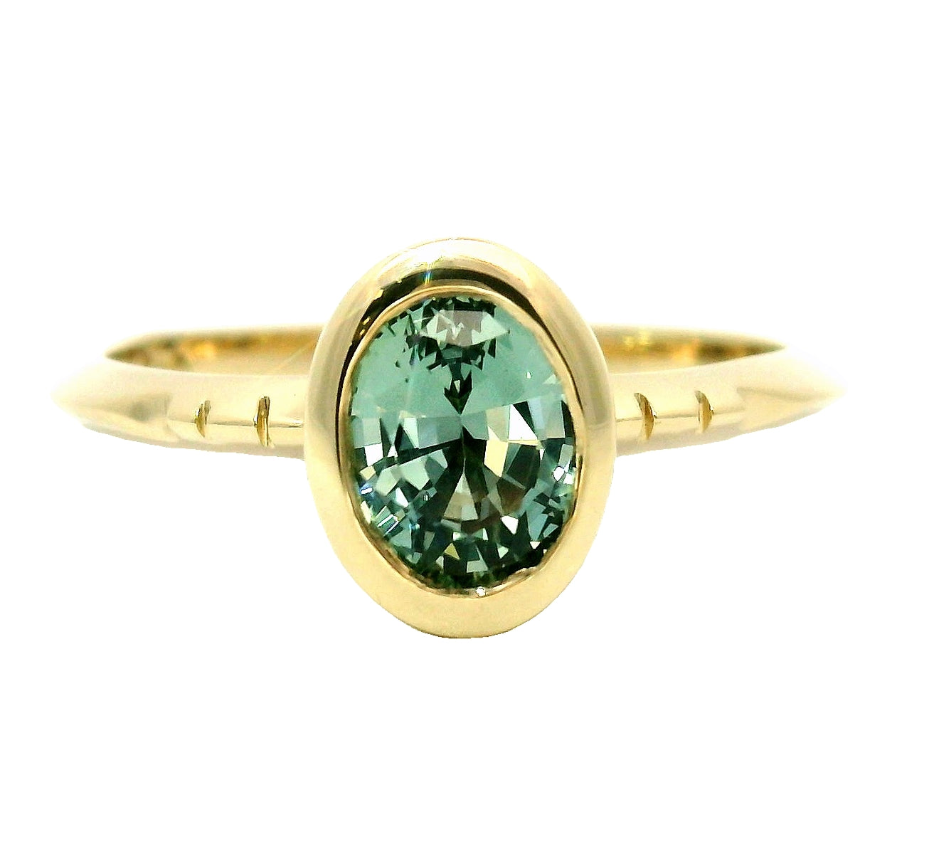 14k recycled yellow gold, 1.01 ct., heat treated, oval-cut, Montana mined sapphire measuring 6.50 x 5.50mm. This sapphire is from the Rock Creek deposit