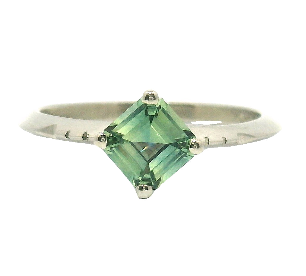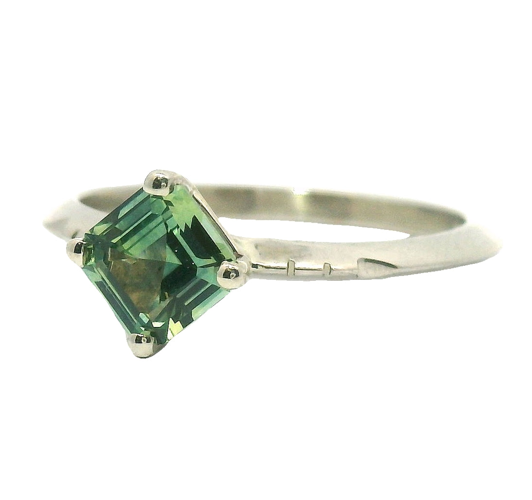 A beautiful color shifting sapphire from electric green to steel grey green depending on the light. The clarity is so crisp that it allows you to travel deep into these step cut facets that bring the Art- Deco vibe that we love about asscher cut stones. Our hand carved triangle, Helena style band, adds another beautiful graphic element to this ring.