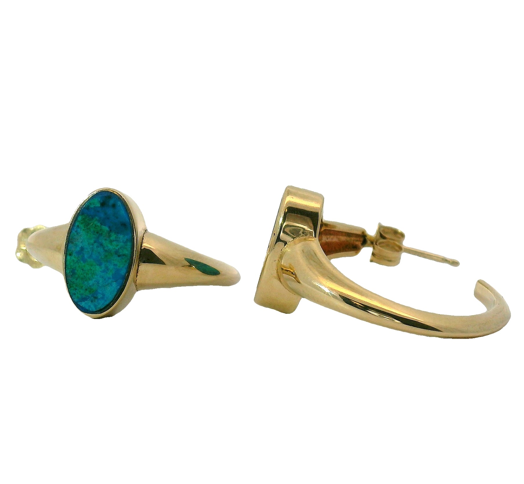 Signet style earrings sure to be noticed for their gem-green and blue, Chrysocolla inlay and heavy gold look. These earrings are sure to become your daily go to style.