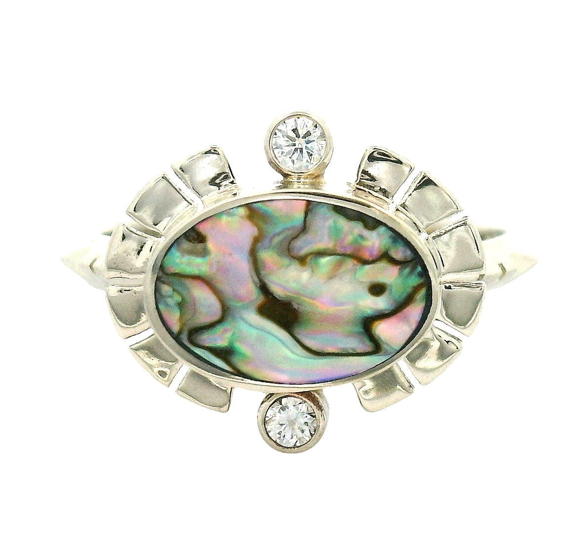 14k recycled, non-rhodium plated white gold, .03 ct post-consumer white diamonds, inlaid Abalone shell from the coast of California.