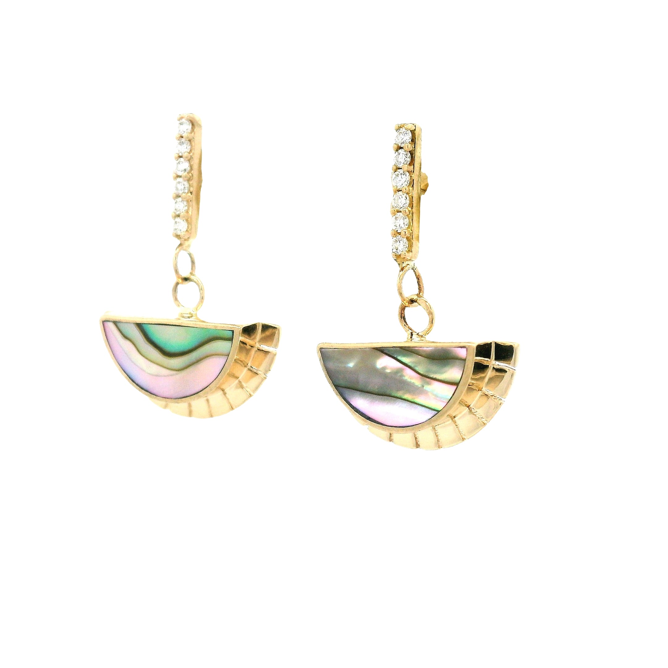 A half moons earrings with inlaid abalone shell . This etherial and colorful shell is wrapped in 14k yellow gold. The serrated halo of gold makes these etherial and beautiful. The charms dangle from a gold and white diamond bar style post earrings, that shimmer with with every movement.