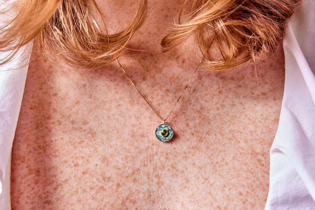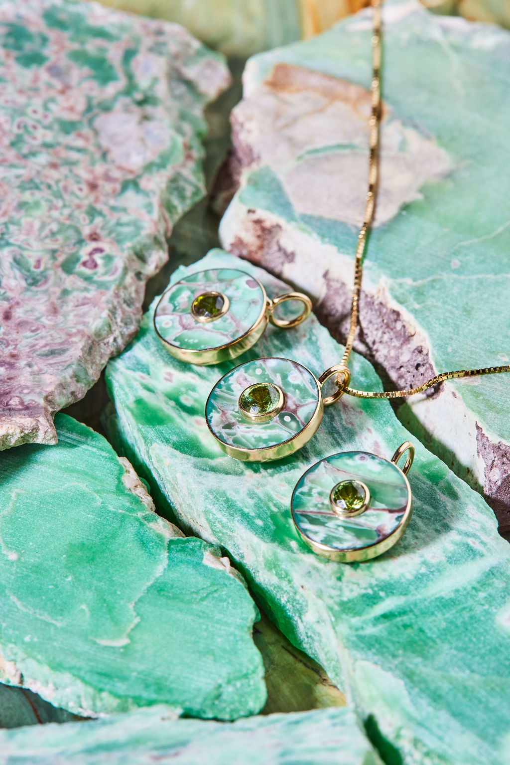 This ethical jewelry pendant features a psychedelic green Lucin variscite inlay, responsibly sourced from Utah, with a Colorado-mined peridot set at its center. The variscite displays organic swirls of brown and soft green, creating a planet-like pattern that is completely natural and entirely one of a kind. The result is a vibrant mix of earthy green tones that cannot be replicated, making each pendant truly unique.
