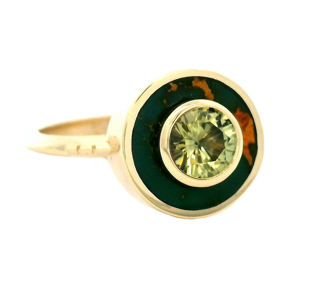 This one-of-a-kind ring features a rich deep green and gold inlay of Turquoise with a light lichen green colored Montana sapphire bezel set in the middle of the turquoise.  These perfectly matching stones are set in 14k yellow gold bezel and features our carved Helena ring band.
