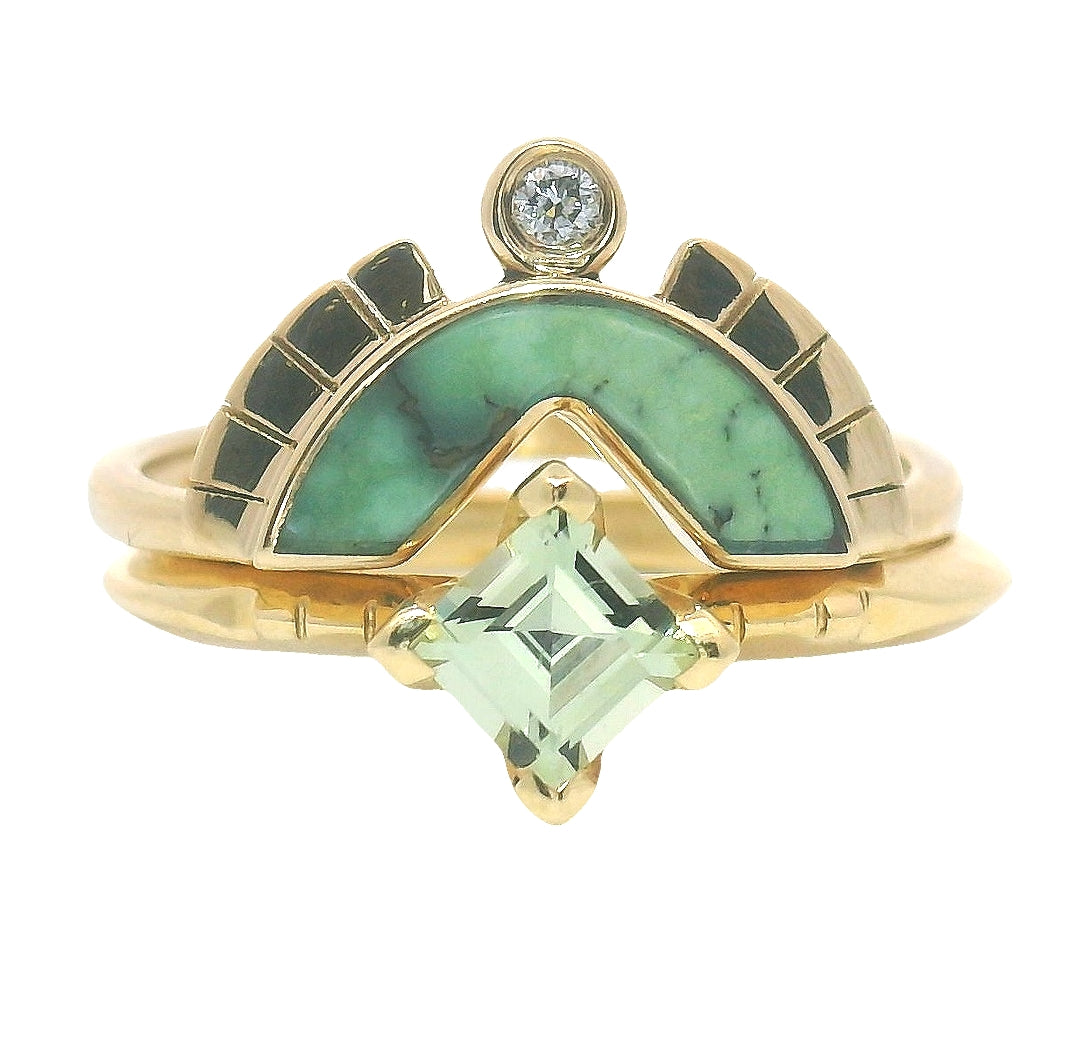 14k recycled yellow gold, .46 ct heat treated Montana Sapphire from the Missouri River deposit. Snowville Variquoise from Utah and a .03 ct recycled white diamond.