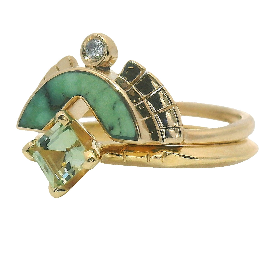 Any ring can be presented as an engagement ring, but not all rings are the best choice for every day forever wear. Diamonds and gold are the traditional materials to wear as engagement or wedding jewelry because they are the most durable. Everyday forever is a long time, so choose wisely when considering a ring to be the everyday representation of your love. It’s a big decision to represent your love with fine jewelry, consider a versatile set that can we worn in all the different times and events in your life. All jewelry requires care and attention, so please realize just because a ring is chosen and presented as a wedding ring, does not mean its appropriate for everyday wear. All jewelry should be taken off before bathing, swimming, yoga, applying lotions, working out, doing the dishes, etc.  We recommend a simple pure gold band as the everyday forever wedding ring. Our inlay  jewelry can be worn as the occasion permits.  More information is explained in our FAQ PAGE.