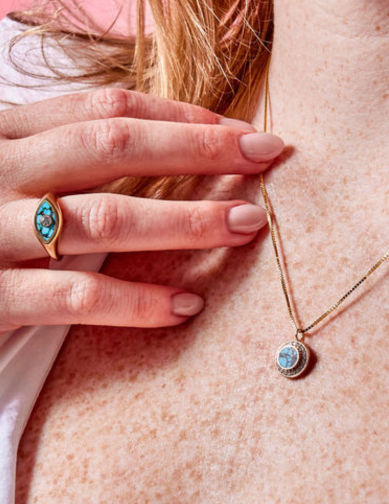 14k recycled yellow gold, No. 8 Turquoise, .20 tcw white reclaimed diamonds.