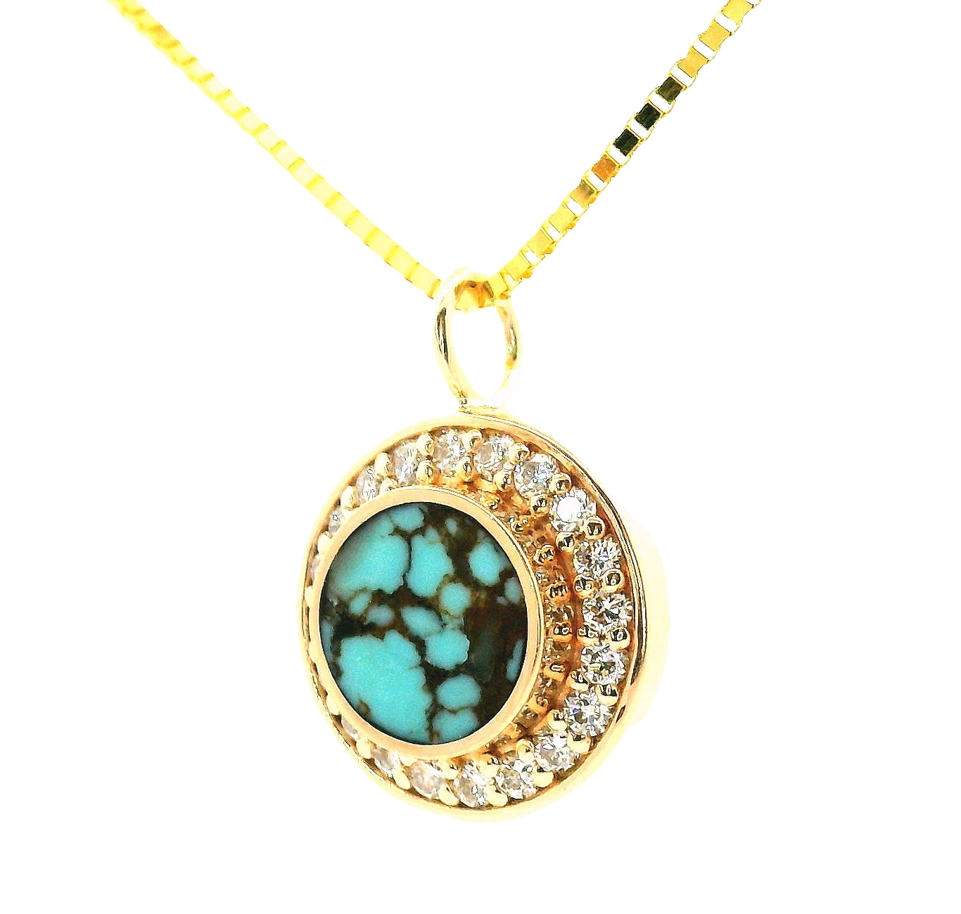 Number 8 turquoise is hand cut and shaped to fit perfectly inside this 14k gold bezel. A halo of pavé set white diamonds elevates this necklace into an etherial, wedding day quality piece.  The beautiful pendant swings freely on an 18 inch .75 mm 14k yellow gold chain.