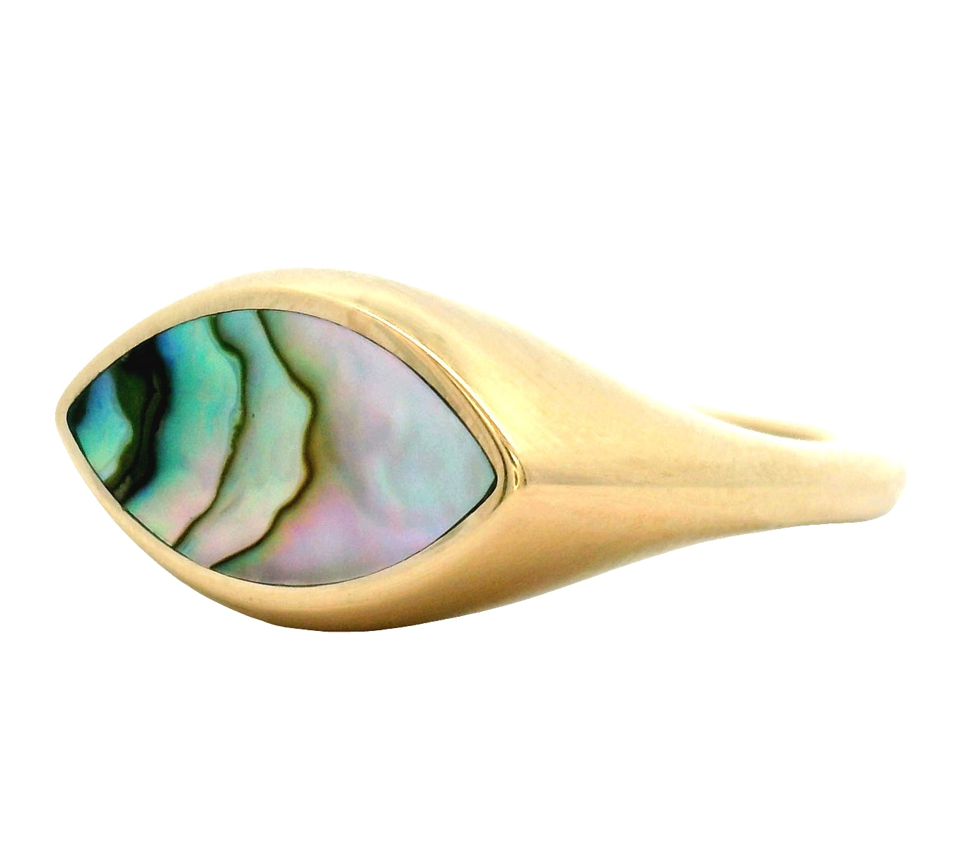 A heavy solid 14k yellow gold marquise shape inlaid with a wild and etherial piece of Abalone shell. The tall silhouette of this ring makes it a instant classic. Big enough of an impact to feel like a signet ring, but colorful enough to be contemporary. This ring is a size 7 and can be resized within 1 size up or down.