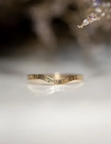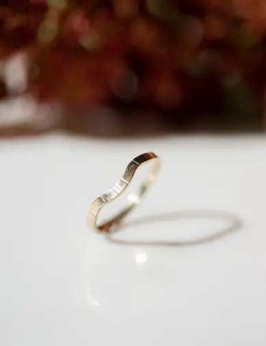 A beautiful band featuring a subtle curve that can should match most prong set solitaire rings. The signature YITM carved grooves are organically placed around the band to add texture and subtle dimension. This medium Arc measures 1.5 mm x 1.5 mm square. A similar ring is ready to ship in a size 6 and can be resized up or down within 3 sizes. A custom band in any size or metal color can also be made just for you.
