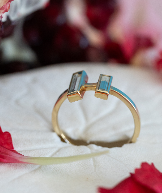 This Montana Sapphire Castor Ring features a unique setting with geometric cut Montana sapphires held securely in a stylish invisible bezel setting. It guarantees unique and timeless elegance with a bold statement.