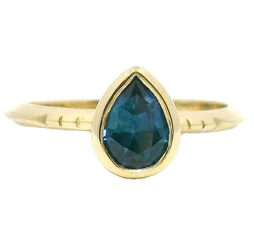 This beautiful pear-cut, Montana sapphire is held in a secure full bezel setting and showcased on our hand carved, triangle band. It is a graphic and beautiful addition to this stunning center stone.  The sapphire is a crisp, sparkling deep blue stone with flashes of black and royal blue.