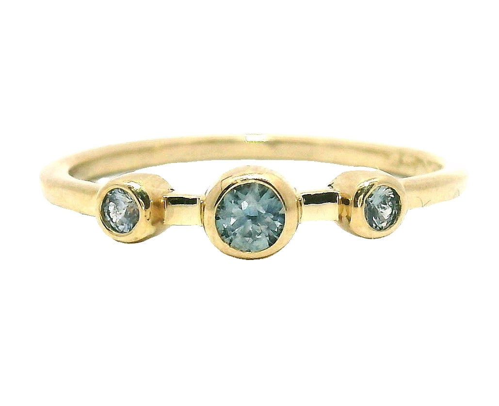 This ring is a size 7. It can be sized up or down within 3 sizes. Add some color to your style with the Cerberus Montana Sapphire Ring. This ring has a yellow gold band and is bezel set with three blue-green sapphires. It's a powerful piece that won't go unnoticed and is durable and comfortable for everyday wear.   Perfect for celebrating a new baby and a new family of three! Or to honor three children.