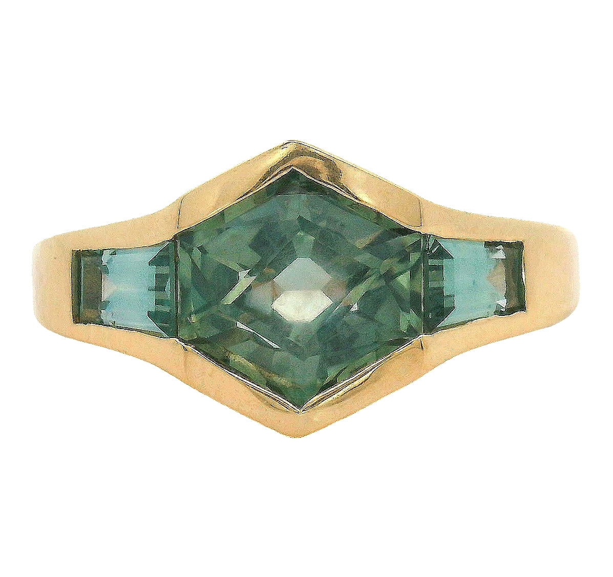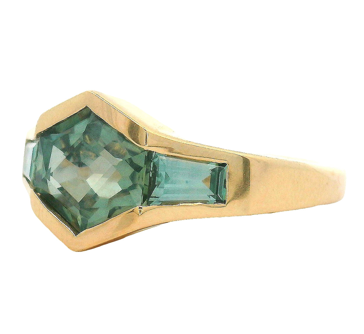 A three-stone Montana sapphire ring that moves fluidly between tones of sea green and sky blue. The hexagon-cut Montana sapphire at the center evokes a stormy green sea, with crisp, clear facets and an even, saturated color. Bright, tapered baguette side stones lean slightly bluer in tone, yet transition seamlessly into the center stone for a cohesive, uninterrupted flow.